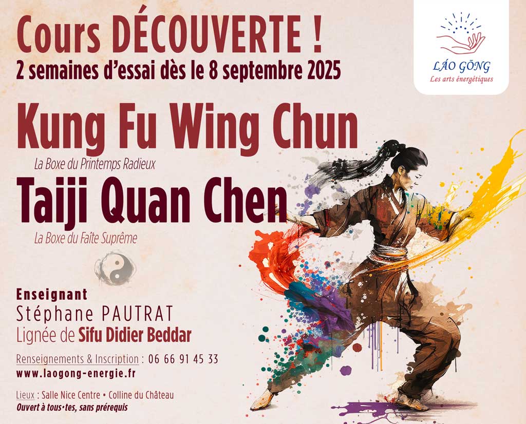 Láo Gōng vous propose de venir découvrir dès le 8 septembre, durant 2 semaines, le Kung Fu Wing Chun et le Taiji Quan style Chen. Venez essayer gratuitement ces deux disciplines ☯️