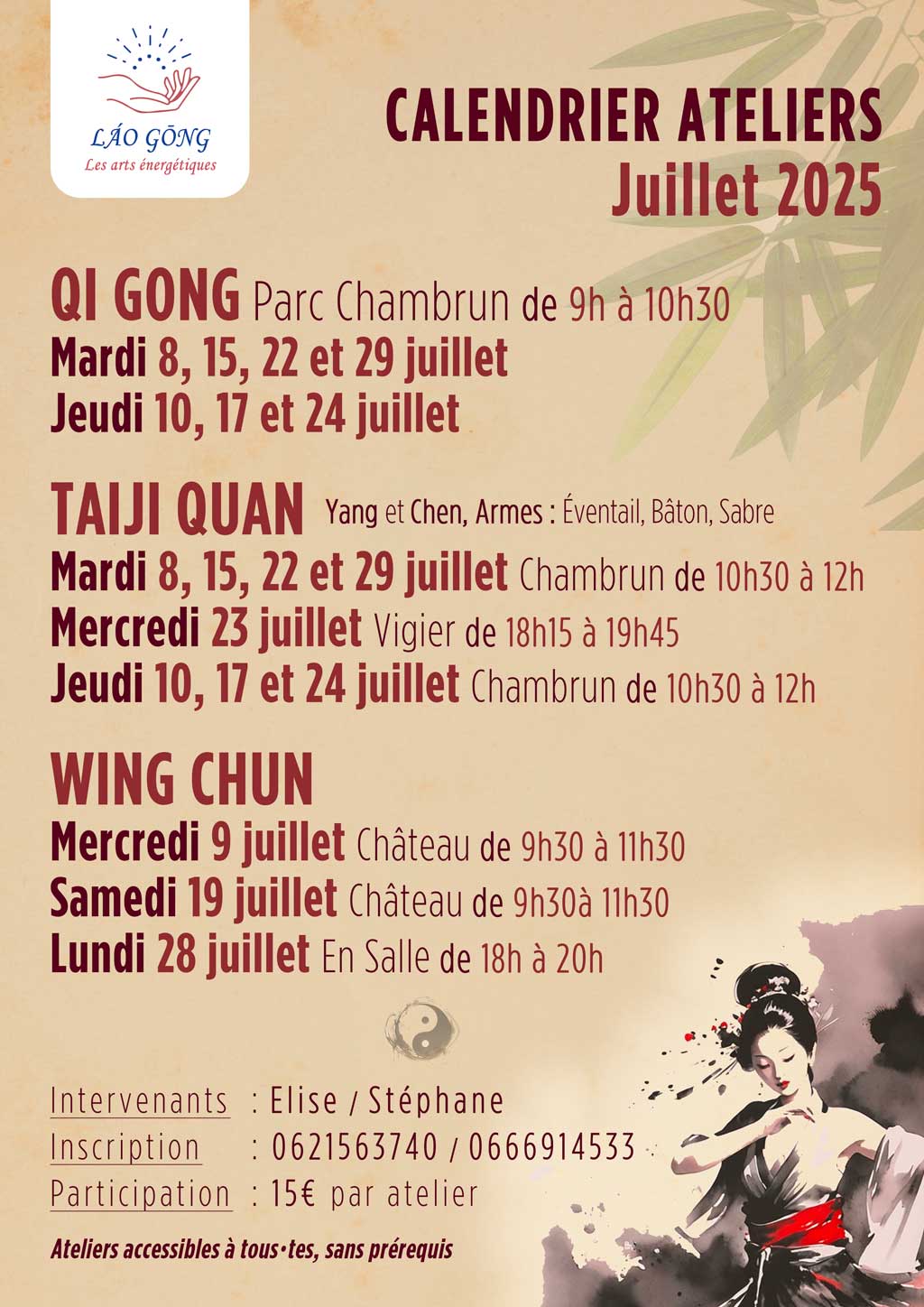 | Cet été, Láo Gōng vous propose des ateliers de Qi Gong, Taiji Quan (Taichi Chuan) et Kung Fu Wing Chun à Nice à partir du 8 juillet ☯️ Voici le calendrier des pratiques proposées en juillet :